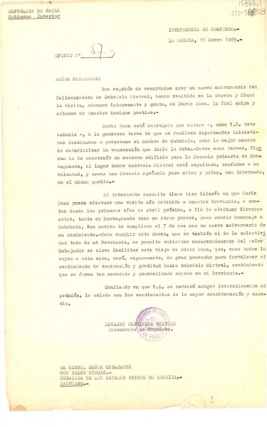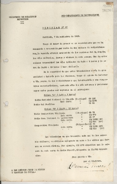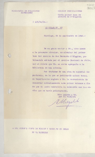 Circular N° 53, 1947 sept. 23, Santiago [a] los señores representantes diplomáticos y consulares de Chile [manuscrito] El Ministro [Germán Vergara Donoso].