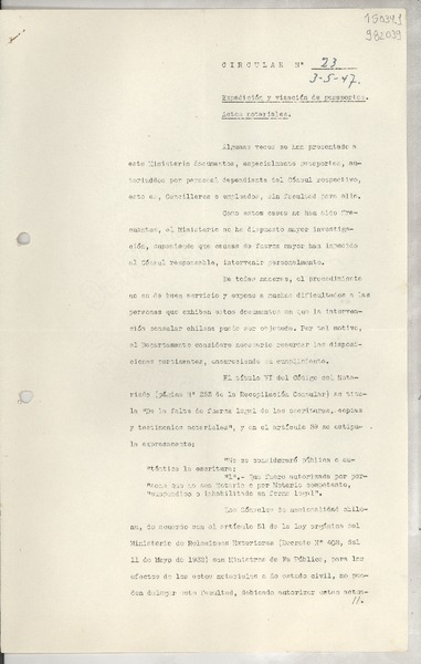 Circular N° 23, 1947 mayo 3 Expedición y visación de pasaportes. Actos notariales [manuscrito] : Manuel Trucco.