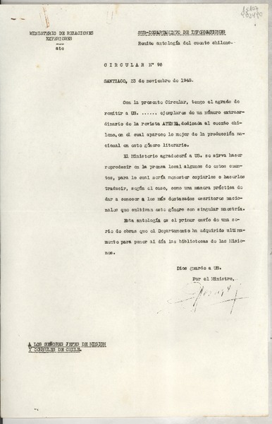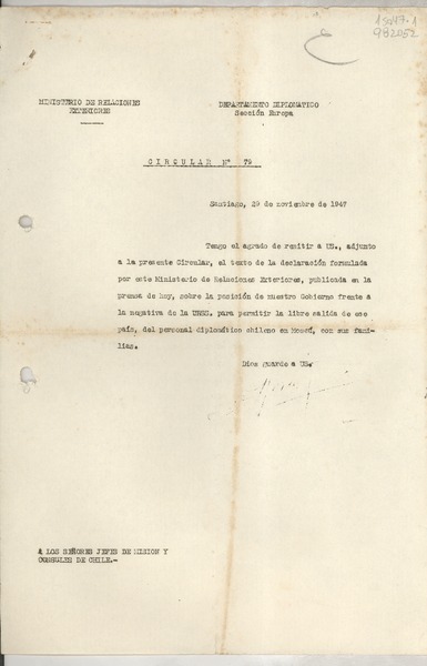 Circular N° 73, 1947 nov. 18, Santiago, [Chile] [a los] Señores Jefes de Misión y Cónsules de Chile [manuscrito] El Ministro [Germán Vergara Donoso].