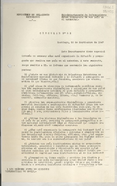 Circular N° 52, 1947 sept. 22, Santiago [a] los señores jefes de misiones diplomaticas de Chile [manuscrito] El Ministro [Germán Vergara Donoso].