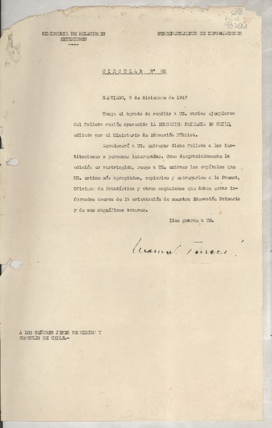Circular N° 83, 1947 dic. 19, Santiago, [Chile] [al] Señor Cónsul de Chile en Santa Barbara, Cal., Estados Unidos [manuscrito] Manuel Trucco.