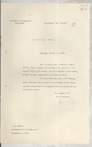 Circular N° 56, 1947 oct. 8, Santiago [a] los señores Representantes Diplomáticos y Consulares de Chile [manuscrito] El Ministro [Germán Vergara Donoso].