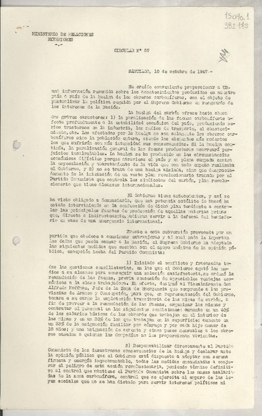 Circular N° 57, 1947 oct. 10, Santiago [a] los señores Jefes de Misión y Consules de Chile [manuscrito] El Ministro [Germán Vergara Donoso].