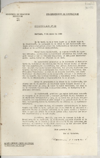 Circular N° 18, 1948 mar. 5, Santiago [a] los señores Jefes de Misión y Consules de Chile [manuscrito] Manuel Trucco.
