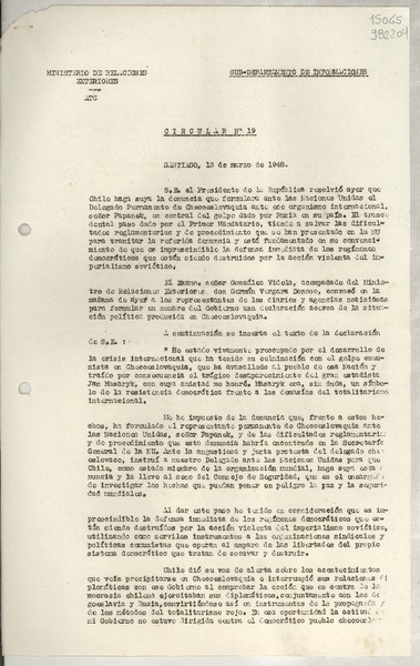 Circular N° 19, 1948 mar. 13, Santiago [a] los señores Jefes de Misión y Consules de Chile [manuscrito] Manuel Trucco.