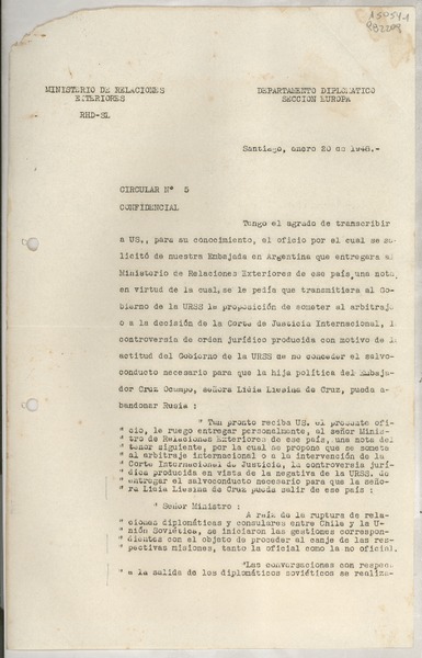 Circular N° 5 confidencial, 1948 ene. 20, Santiago, [Chile] [manuscrito] Germán Vergara Donoso.