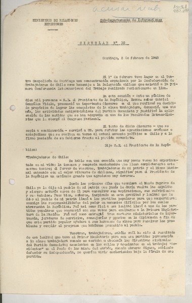 Circular N° 10, 1948 feb. 2, Santiago, [Chile] [a] Los Señores Jefes de Misión y Cónsules de Chile [manuscrito] Manuel Trucco.