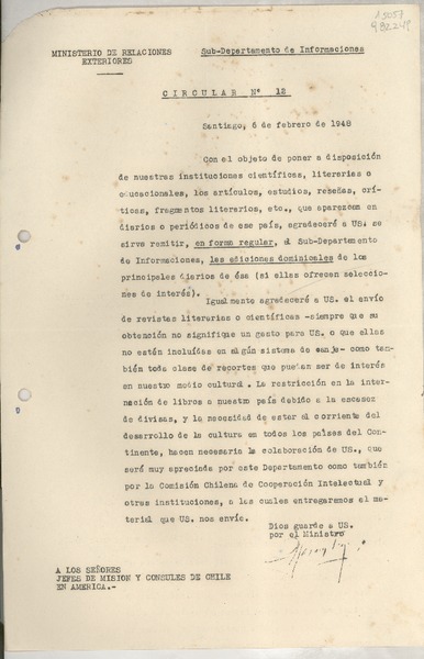 Circular N° 12, 1948 feb. 6, Santiago, [Chile] [a] Los Señores Jefes de Misión y Cónsules de Chile en América [manuscrito] Germán Vergara Donoso.