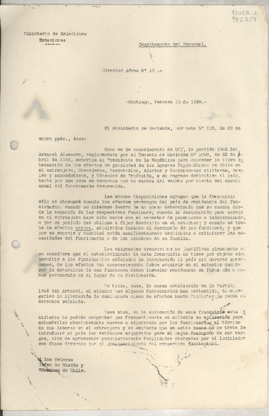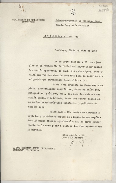 Circular N° 86, 1948 oct. 25, Santiago [a] los señores Jefes de Misión y Consules de Chile [manuscrito]