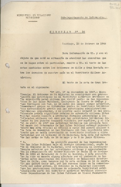 Circular N° 14, 1948 feb. 13, Santiago, [Chile] [a] Los Señores Jefes de Misión y Cónsules de Chile en el exterior [manuscrito] Manuel Trucco.