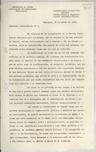 Circular N° 74, 1948 sept. 24, Santiago [a] los señores Jefes de Misión y Consules de Chile [manuscrito]