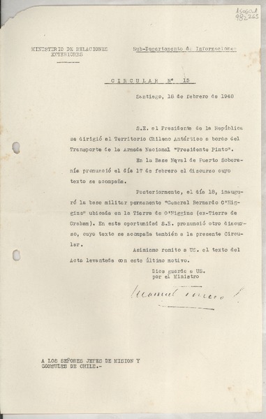 Circular N° 15, 1948 feb. 18, Santiago, [Chile] [a] Los Señores Jefes de Misión y Cónsules de Chile [manuscrito] Manuel Trucco.