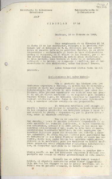 Circular N° 16, 1948 feb. 18, Santiago, [Chile] [manuscrito] Manuel Trucco.