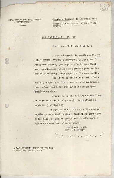 Circular N° 27, 1948 abr. 17, Santiago [a] los Señores Jefes de Misión y Consules de Chile [manuscrito] Manuel Trucco.