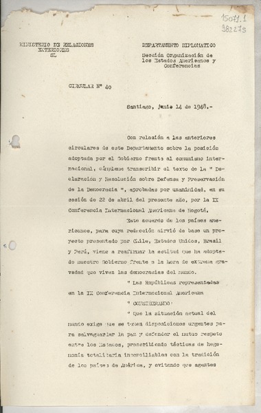 Circular N° 40, 1948 jun. 14, Santiago [a] los Señores Jefes de Misión y Consules de Chile [manuscrito] Manuel Trucco.