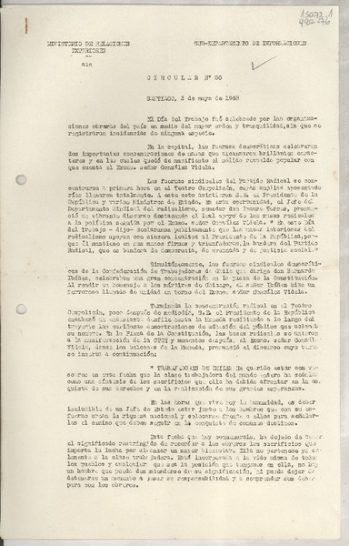 Circular N° 30, 1948 mayo 3, Santiago, [Chile] [a] Los Señores Jefes de Misión y Cónsules de Chile [manuscrito] Manuel Trucco.