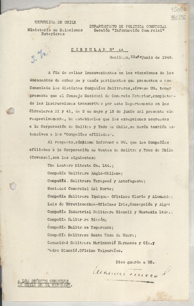 Circular N° 44, 1948 jun. 23, Santiago [a] los Señores Consules de Chile en el exterior [manuscrito] Manuel Trucco.