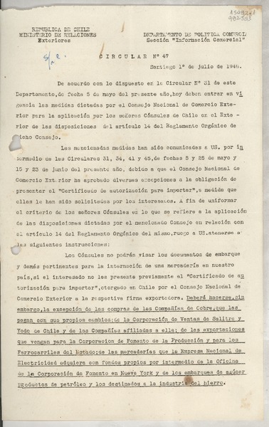 Circular N° 47, 1948 jul. 1, Santiago, [Chile] [a] Los Señores Cónsules de Chile en el exterior [manuscrito] Germán Vergara Donoso.