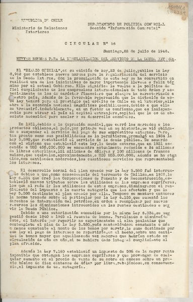 Circular N° 56, 1948 jul. 22, Santiago, [Chile] [a] Los Señores representantes diplomáticos y consulares de Chile en el exterior [manuscrito] Manuel Trucco.