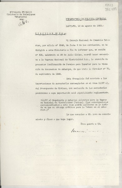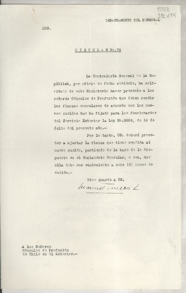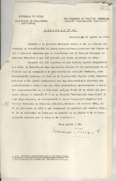 Circular N° 62, 1948 ago. 20, Santiago, [Chile] [a] Los Señores representantes diplomáticos y consulares de Chile en el exterior [manuscrito] Manuel Trucco.