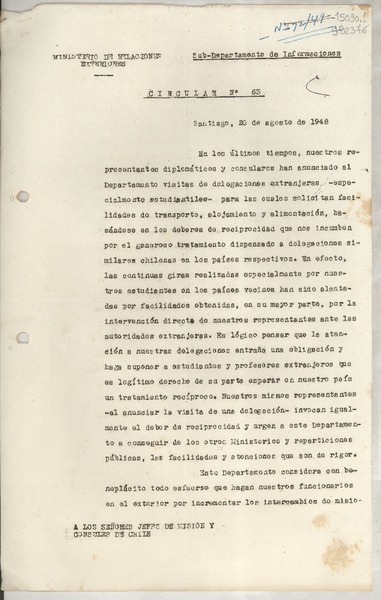 Circular N° 63, 1948 ago. 20, Santiago [a] los Señores Jefes de Misión y Consules de Chile [manuscrito] Manuel Trucco.