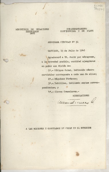 Aérograma Circular N° 31, 1948 jul. 13, Santiago, [Chile] [a] Las misiones y consulados de Chile en el exterior [manuscrito] Manuel Trucco.