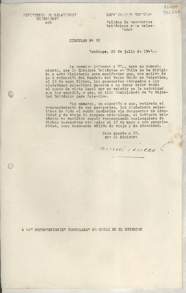 Circular N° 55, 1948 jul. 20, Santiago, [Chile] [a] Los representantes consulares de Chile en el exterior [manuscrito] Manuel Trucco.