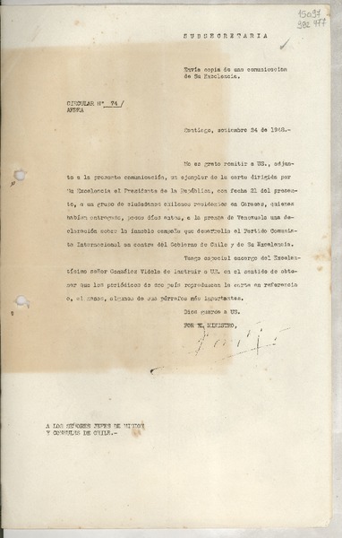 Circular N° 71, 1947 nov. 7, Santiago, [Chile] [a los] Señores Jefes de Misión y Cónsules de Chile [manuscrito] El Ministro [Germán Vergara Donoso].