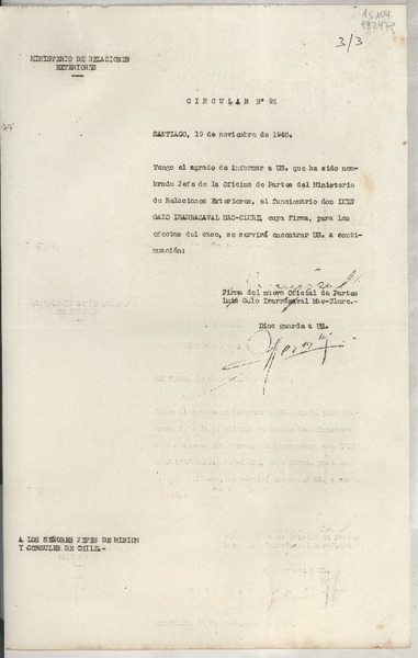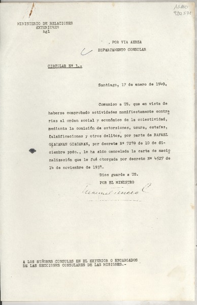 Circular N° 3, 1949 ene. 17, Santiago, [Chile] [a] Los Señores Cónsules en el exterior o Encargados de las Secciones Consulares de las Misiones [manuscrito] Manuel Trucco.