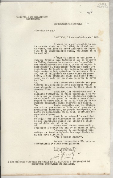 Circular N° 93, 1948 nov. 19, Santiago, [Chile] [a] Los Señores Cónsules de Chile en el exterior y Encargados de Secciones Consulares de Misiones [manuscrito] Germán Vergara Donoso.