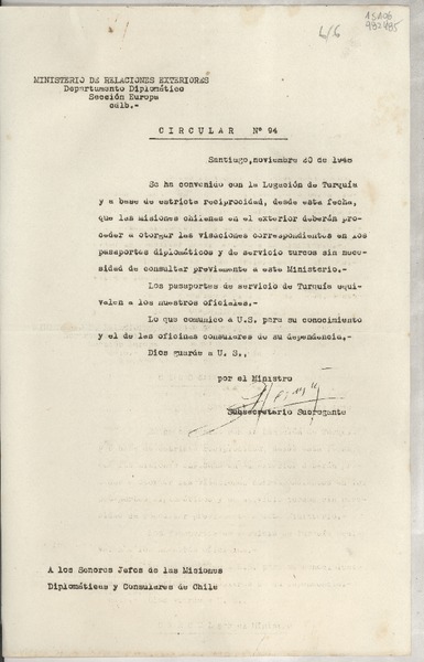 Circular N° 94, 1948 nov. 20, Santiago, [Chile] [a] Los Señores Jefes de las Misiones Diplomáticas y Consulares de Chile [manuscrito] Germán Vergara Donoso.