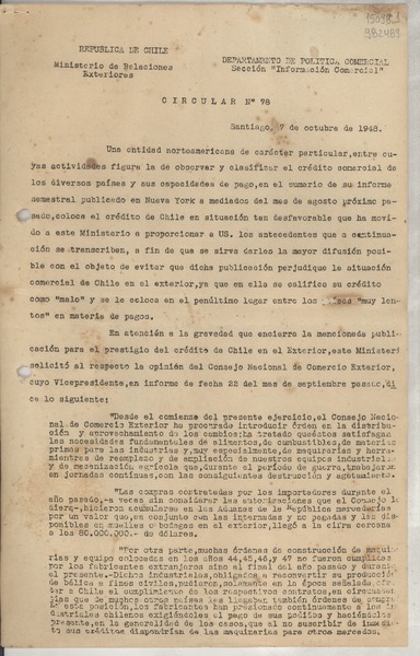 Circular N° 78, 1948 oct. 7, Santiago [a] los señores Representantes Diplomáticos y Consulares de Chile en el exterior [manuscrito]