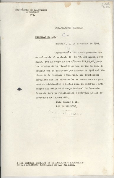 Circular N° 102, 1948 dic. 27, Santiago, [Chile] [a] Los Señores Cónsules en el exterior o Encargados de las Secciones Consulares de las Misiones [manuscrito] Manuel Trucco.