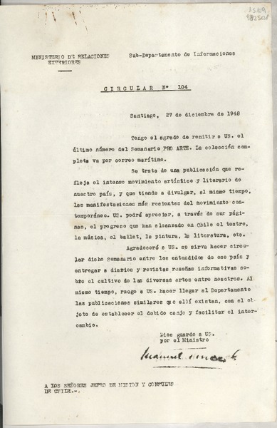 Circular N° 104, 1948 dic. 27, Santiago, [Chile] [a] Los Señores Jefe de Misión y Cónsules de Chile [manuscrito] Manuel Trucco.