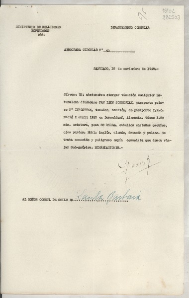 Aerograma Circular N° 40, 1948 nov. 18, Santiago [al] señor Consul de Chile en Santa Barbara [manuscrito]