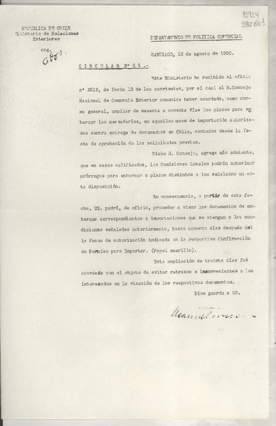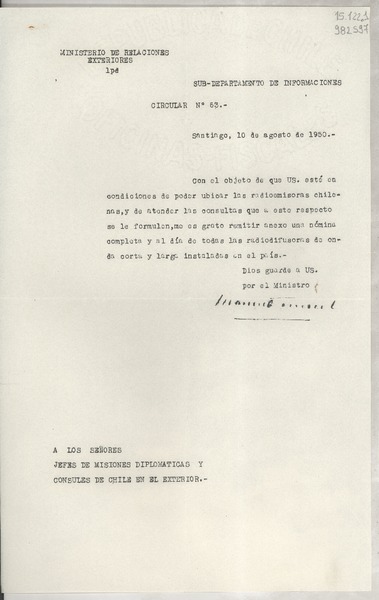 Circular N° 63, 1950 ago. 10, Santiago [a] los señores Jefes de Misiones Diplomáticas y Consules de Chile en el exterior [manuscrito] Manuel Trucco.