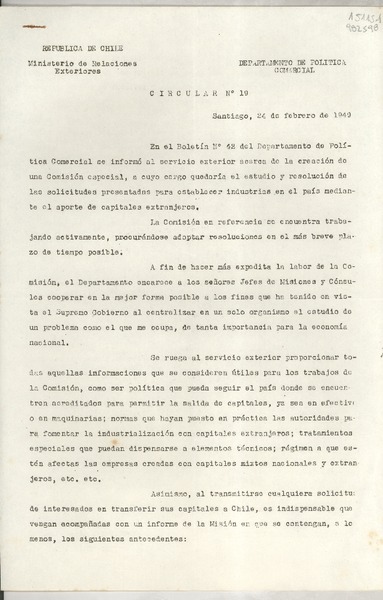 Circular N° 19, 1949 feb. 24, Santiago, [Chile] [manuscrito] Manuel Trucco.
