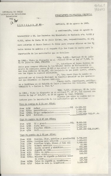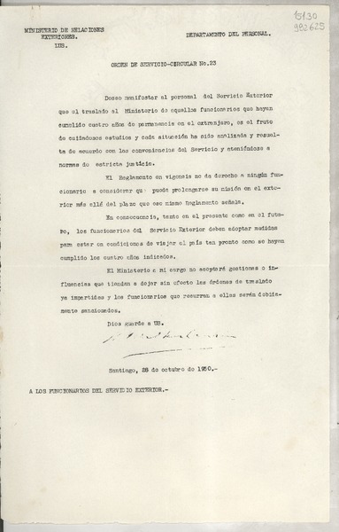 Circular N° 23, 1950 oct. 28, Santiago [a] los funcionarios del servicio exterior [manuscrito]