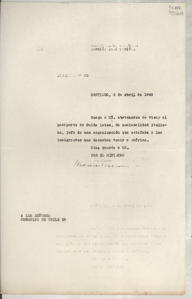 Circular N° 25, 1949 abr. 4, Santiago, [Chile] [a] Los Señores Cónsules de Chile en [manuscrito] Manuel Trucco.