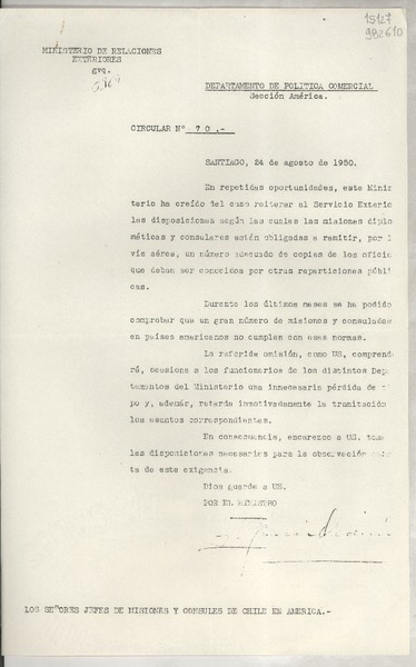Circular N° 70, 1950 ago. 24, Santiago [a] los señores Jefes de Misiones y Consules de Chile en América [manuscrito]
