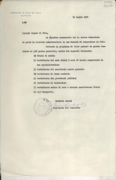 [Oficio] N° 86, 1952 luglio 15, Nápoles, Italia [a] Egregio Signor Di Nola [manuscrito] Secretario del Consulado.