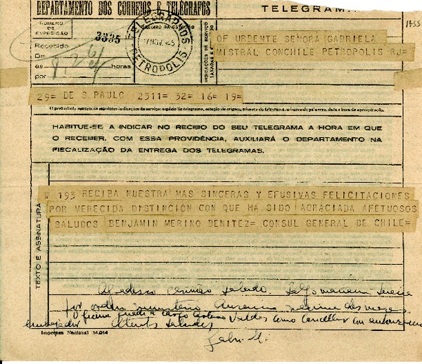 [Telegrama] 1945 nov. 17, Sao Paulo [a] Gabriela Mistral, Petrópolis [manuscrito] Benjamín Merino Benítez.