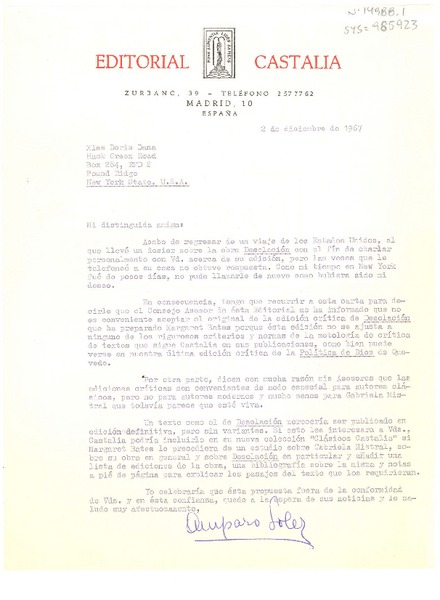 [Carta] 1967 dec. 2, [Madrid, España] [a] Doris Dana, Pound Ridge, U.S.A. [manuscrito] Amparo Soler.