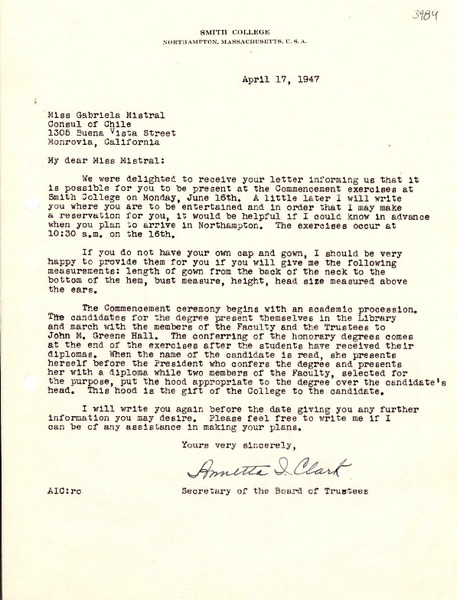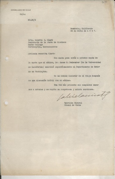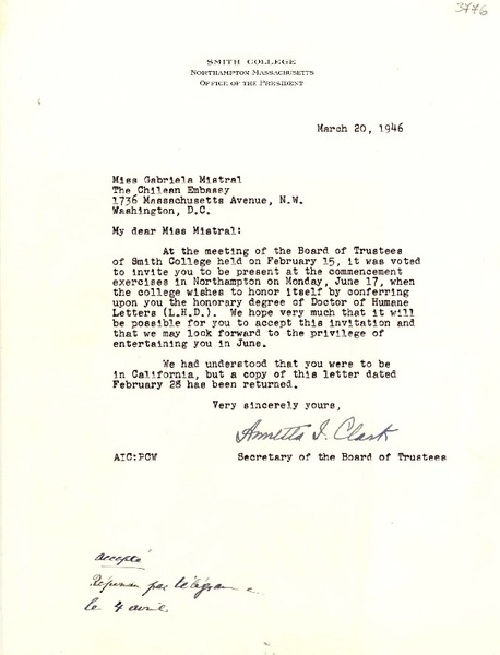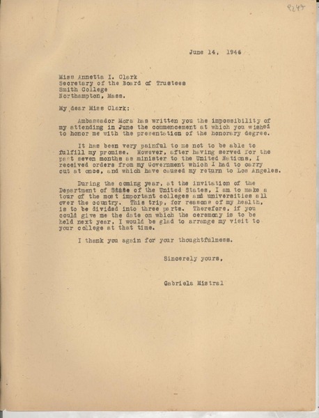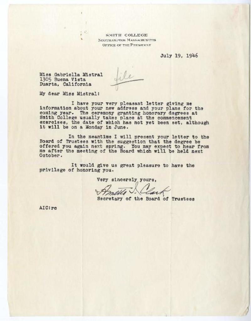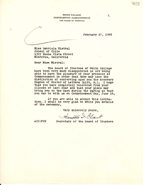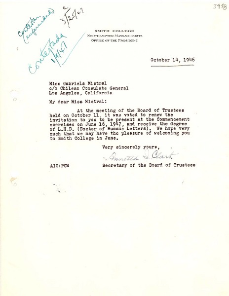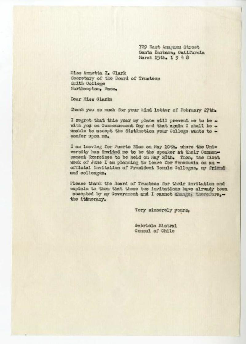 California [a] Annetta I. Clark, Secretary of the Board of Trustees, Smith College, Northampton carta, 1948, [manuscrito] Gabriela Mistral.