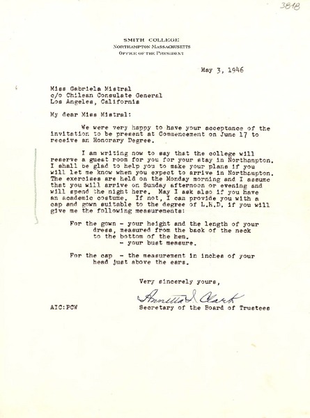 [Carta] 1946 mayo 3, Northampton, Massachusetts [a] Gabriela Mistral, Los Ángeles, California [manuscrito] Annetta I. Clark.
