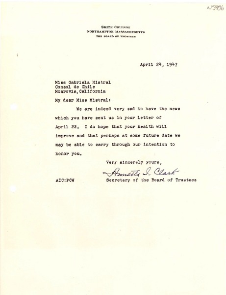 [Carta] 1947 abr. 247, Northampton, Massachusetts [a] Gabriela Mistral, Monrovia, California [manuscrito] Annetta I. Clark.