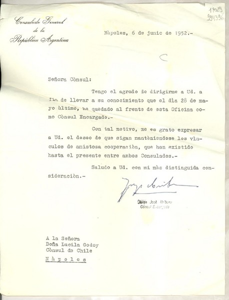 [Carta] 1952 jun. 18, Napoles, [Italia] [a] Honorable Sr. Jorge J. Uriburu, Cónsul encargado, Consulado General de Argentina, Nápoles [manuscrito] Lucila Godoy, Cónsul de Chile.