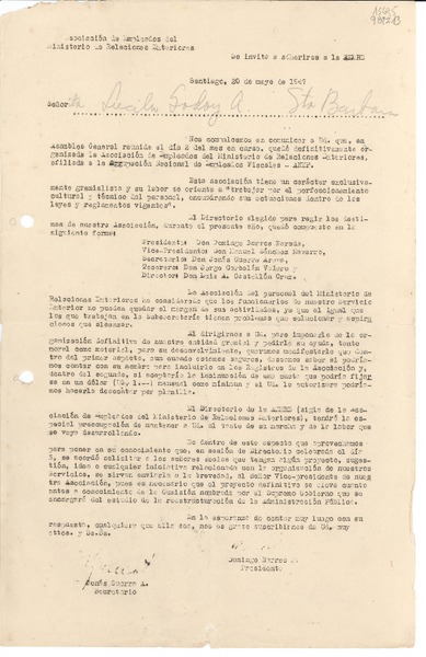 [Circular] 1947 mayo 20, Santiago, [Chile] [a la] Señorita Lucila Godoy A., Santa Barbara, [EE.UU.] [manuscrito] Domingo Barros P., Jonás Guerra A.