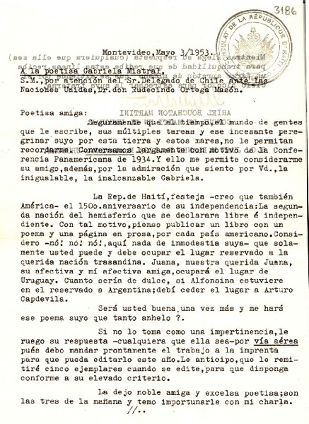 Mistral, Gabriela - Correspondencia - Bouchaton Martini, Ariel - Manuscritos haitianos - Autores haitianos