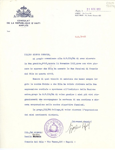 [Carta] 1951 nov. 21, Naples, [Italia] [al] Ill.Mo Signora Lucila Godoy, Console del Cile, Via Tasso, 220, Napoli, [Italia] [manuscrito] / Giovanni Caprio.